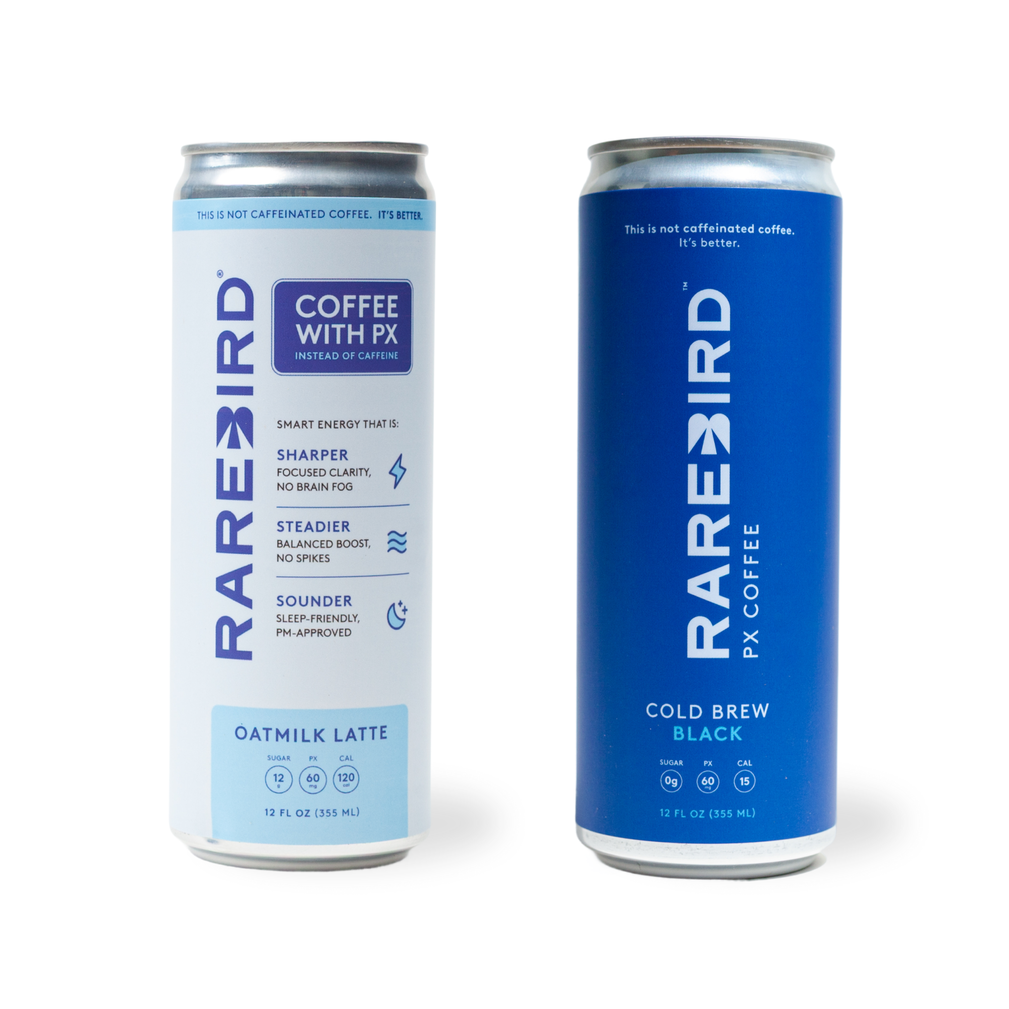 Rarebird uses Px directly, delivering the focus and energy people love from coffee with clearer focus, smoother energy, and none of caffeine’s jittery edge, crash, or sleep disruption.